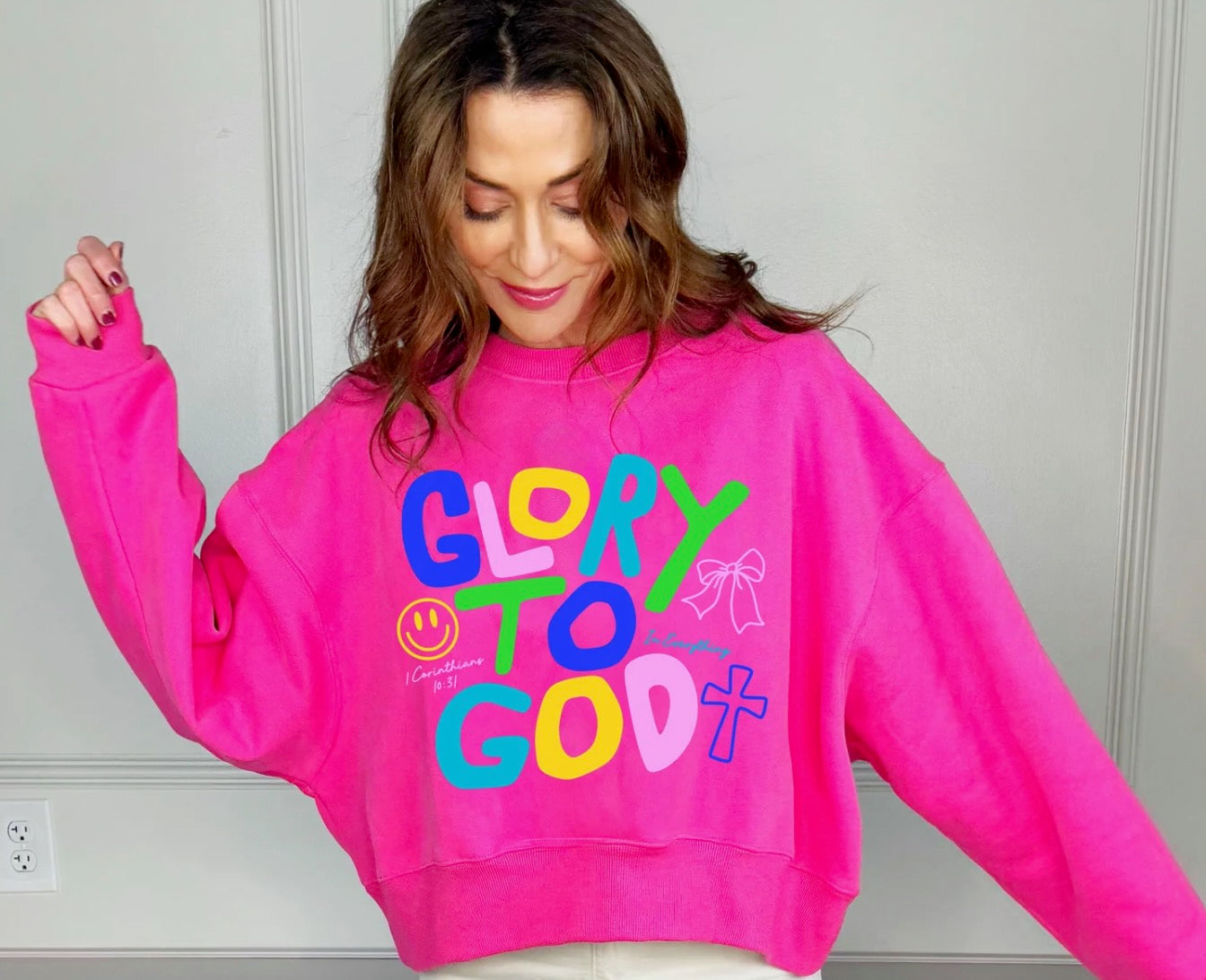 Embrace your faith with our Glory To God Pink Crop Sweatshirt. Made with comfortable material and showcasing an uplifting message, this sweatshirt is perfect for expressing your devotion while staying fashionable. Show your love for God with our sweatshirt.