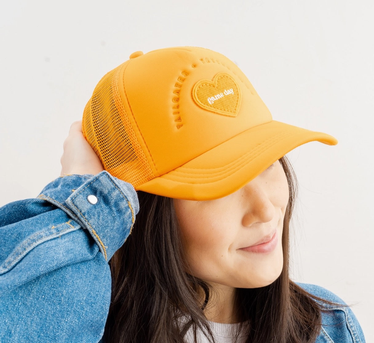 Bring your energy on game day with this bright orange trucker hat! Featuring a heart-shaped "Game Day" patch and "Tailgates & Touchdowns" embroidery, it's the perfect sporty-chic accessory.Adjustable fit, breathable mesh- your go-to cap for football season.