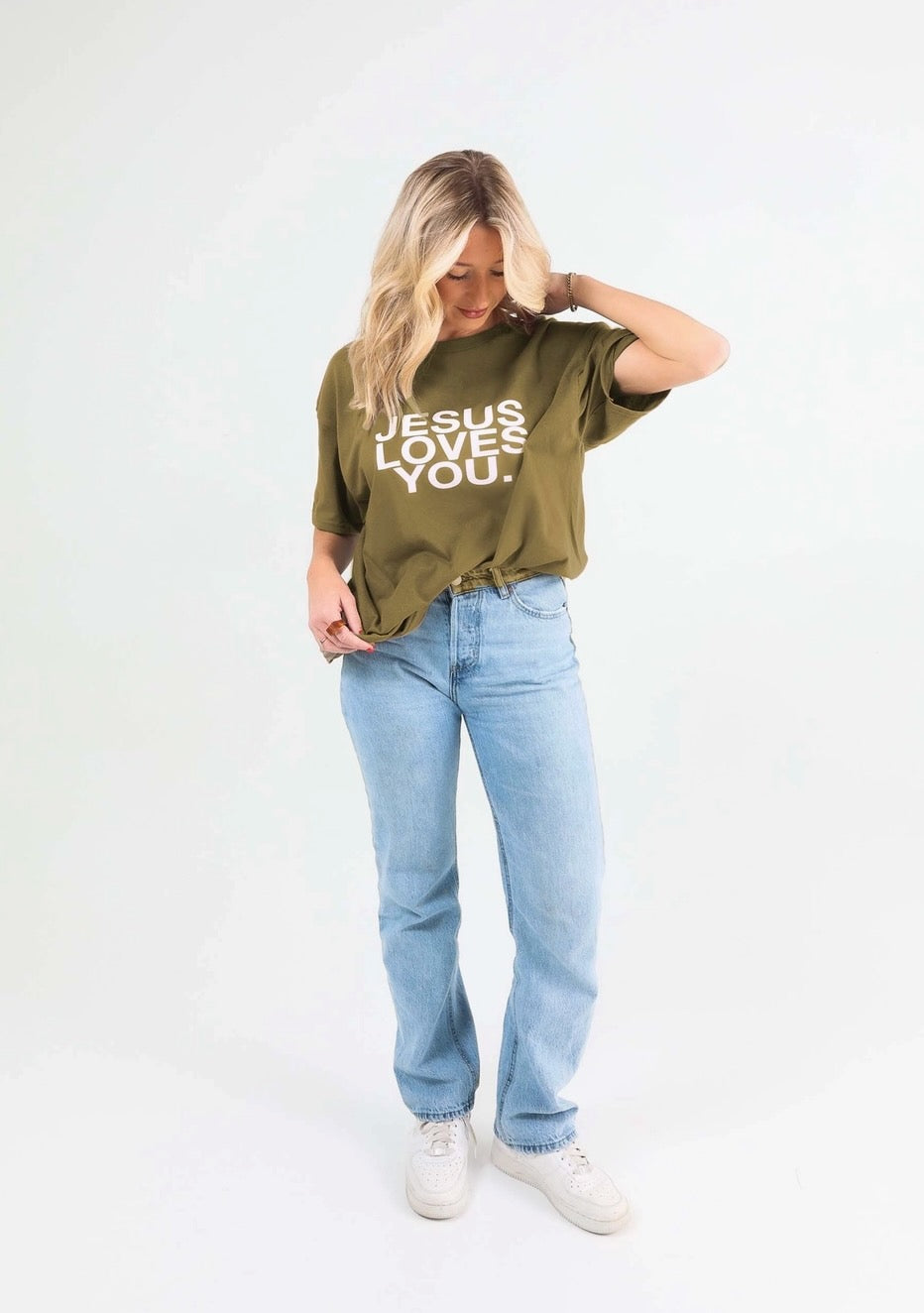 This olive green graphic tee features the bold statement "Jesus Loves You" printed in white block letters across the front. Designed with a relaxed fit, soft cotton fabric, and a classy crew neckline. It offers all-day comfort and effortless style. Perfect for casual wear or layering. This faith-inspired shirt pairs easily with jeans, shorts, or your favorite loungewear!