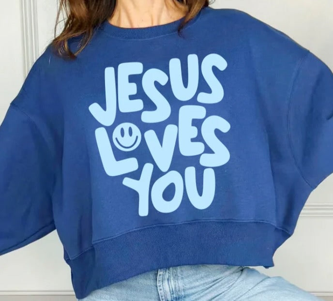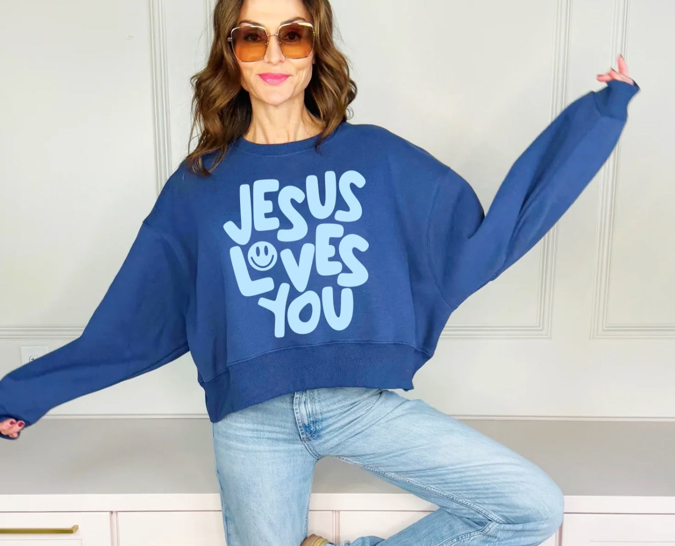 Spread the message of love and faith with our Smiley Jesus Loves You Puff Crop Sweatshirt. Keep warm in this cozy and stylish sweatshirt while sharing positivity with those around you. With its unique design and comfortable fit, this sweatshirt is perfect for expressing your faith and spreading joy.
