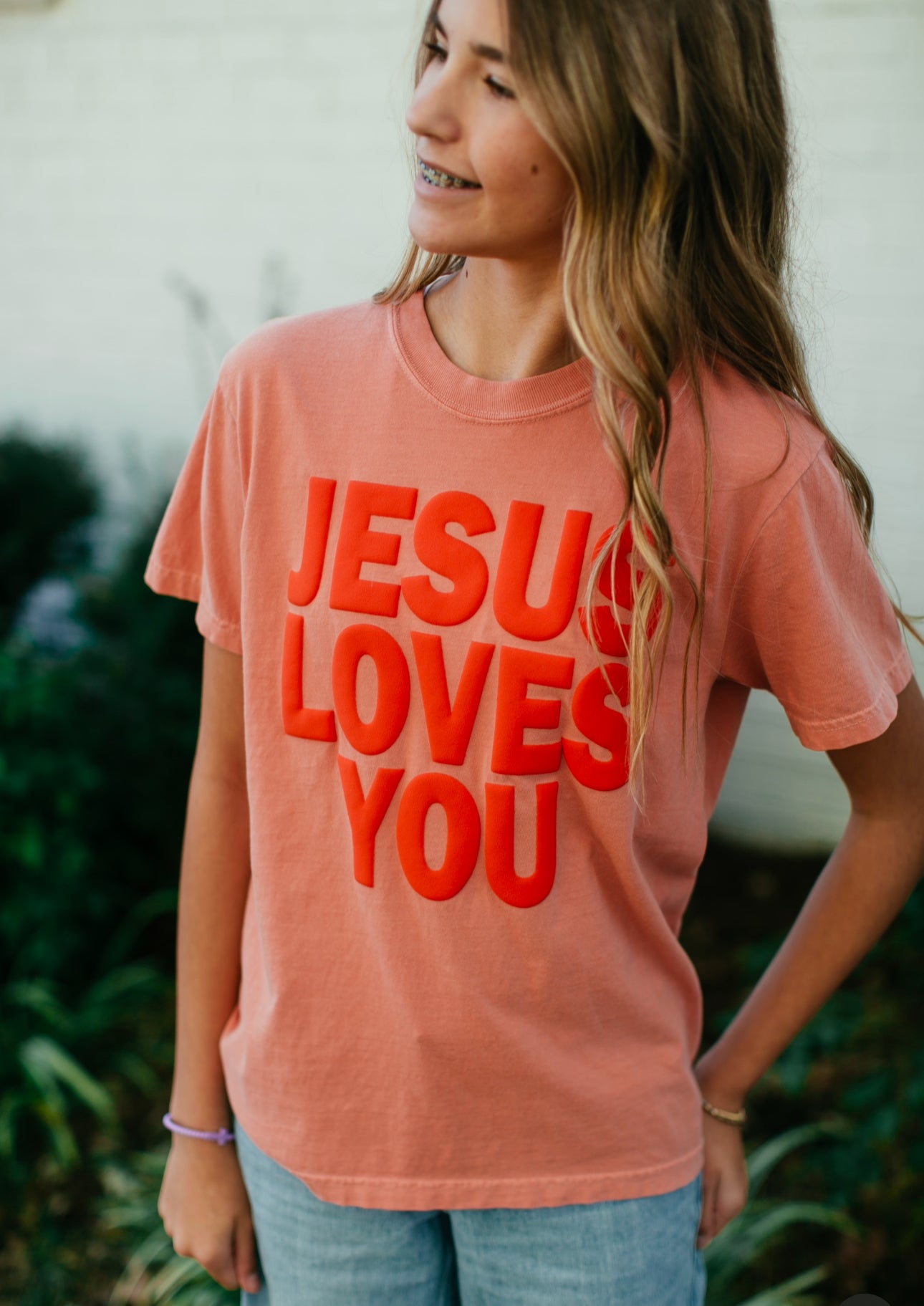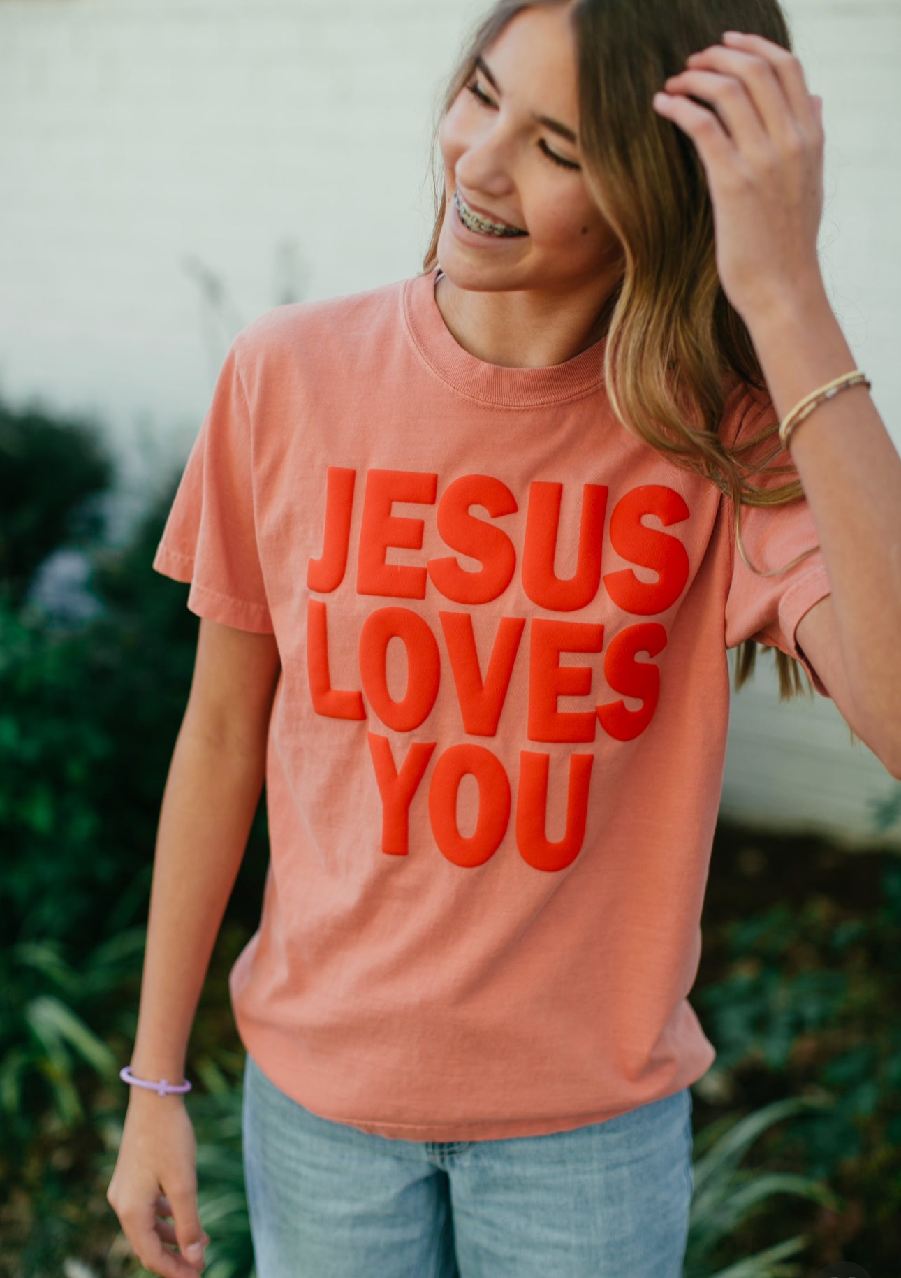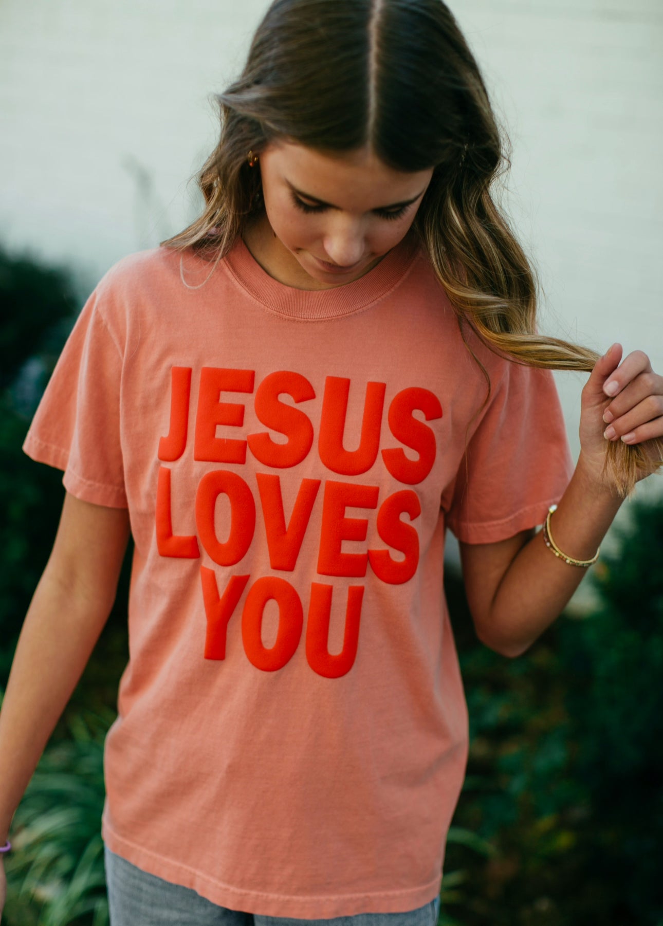 This Comfort Colors tee is a customer favorite for a reason — soft, lived-in feel with a bold, faith-filled message. Made from 100% ring-spun cotton, it features vibrant puff lettering that reads “JESUS LOVES YOU” across the front. The relaxed unisex fit and garment-dyed finish give it that perfect vintage look and feel from day one.