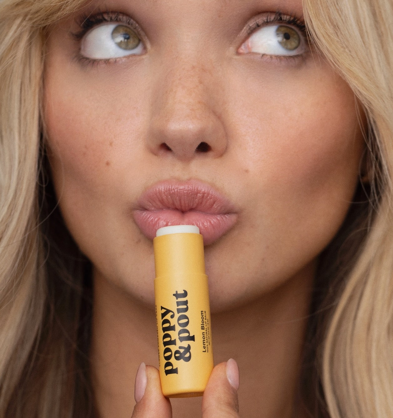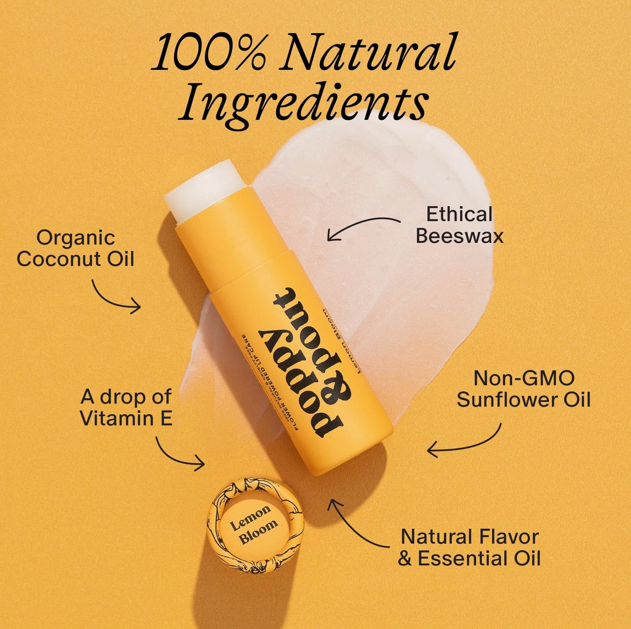 Anyone who enjoys the scent or flavor of lemon will love our Lemon Bloom Lip Balm. It’s both refreshing and hydrating! Every Poppy & Pout lip balm is made with 100% natural ingredients and hand-poured into eco-friendly cardboard tubes.
