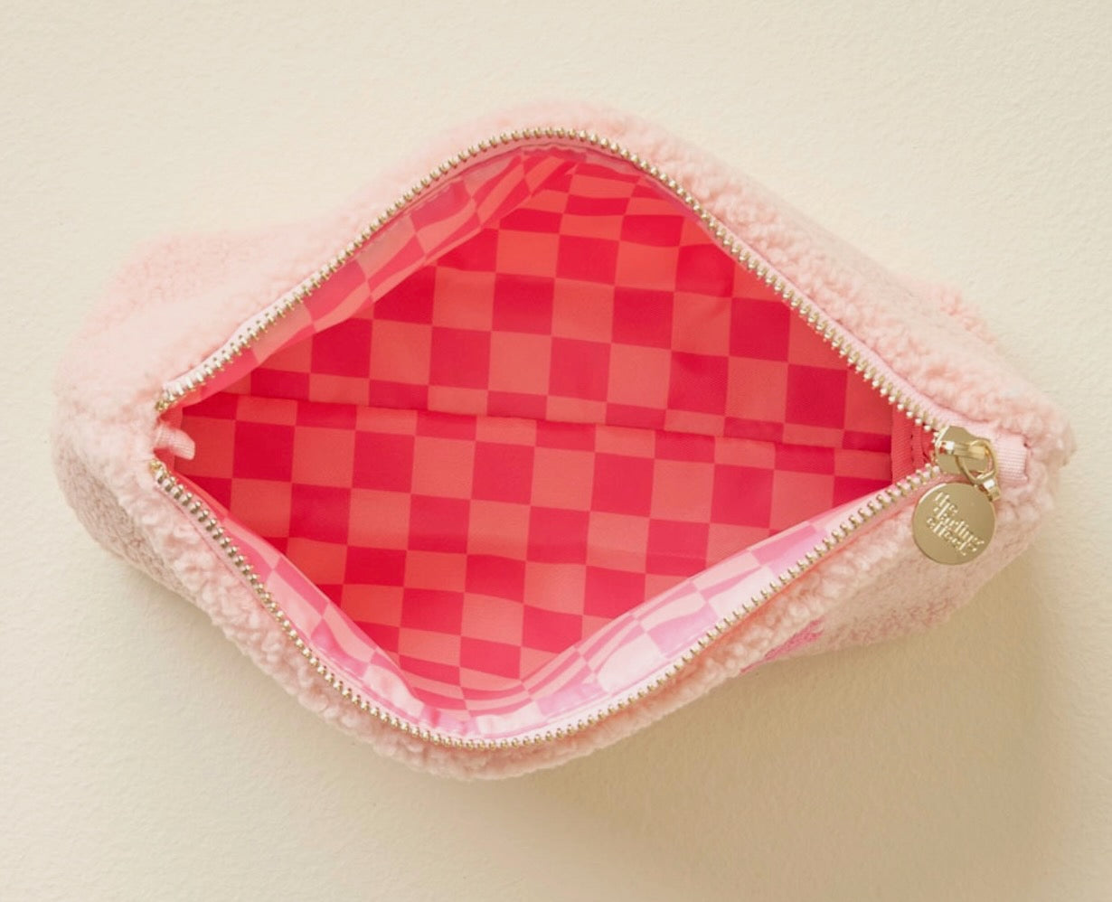 Add a cozy touch to your essentials with our rectangle teddy pouches. Crafted from soft sherpa fabric, these pouches feature a wipeable lining for easy cleaning and gold zippers and hardware for a polished look. The interior is lined with a fun printed fabric, making it as stylish on the inside as it is on the outside. The large rectangle size is perfect for keeping your items organized, and it pairs beautifully with our square or circle options.