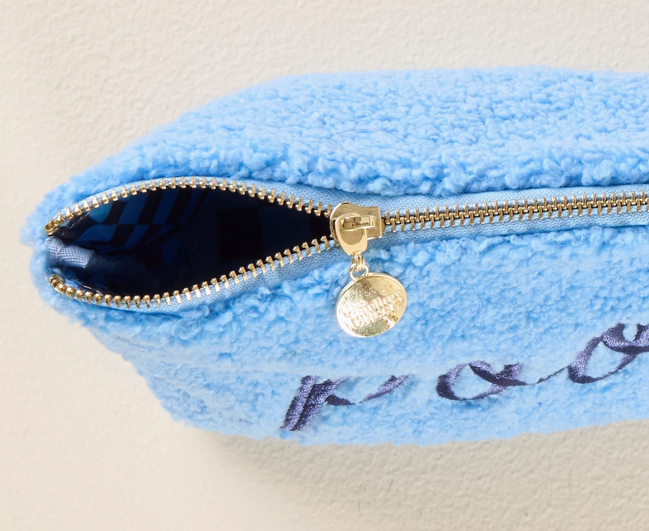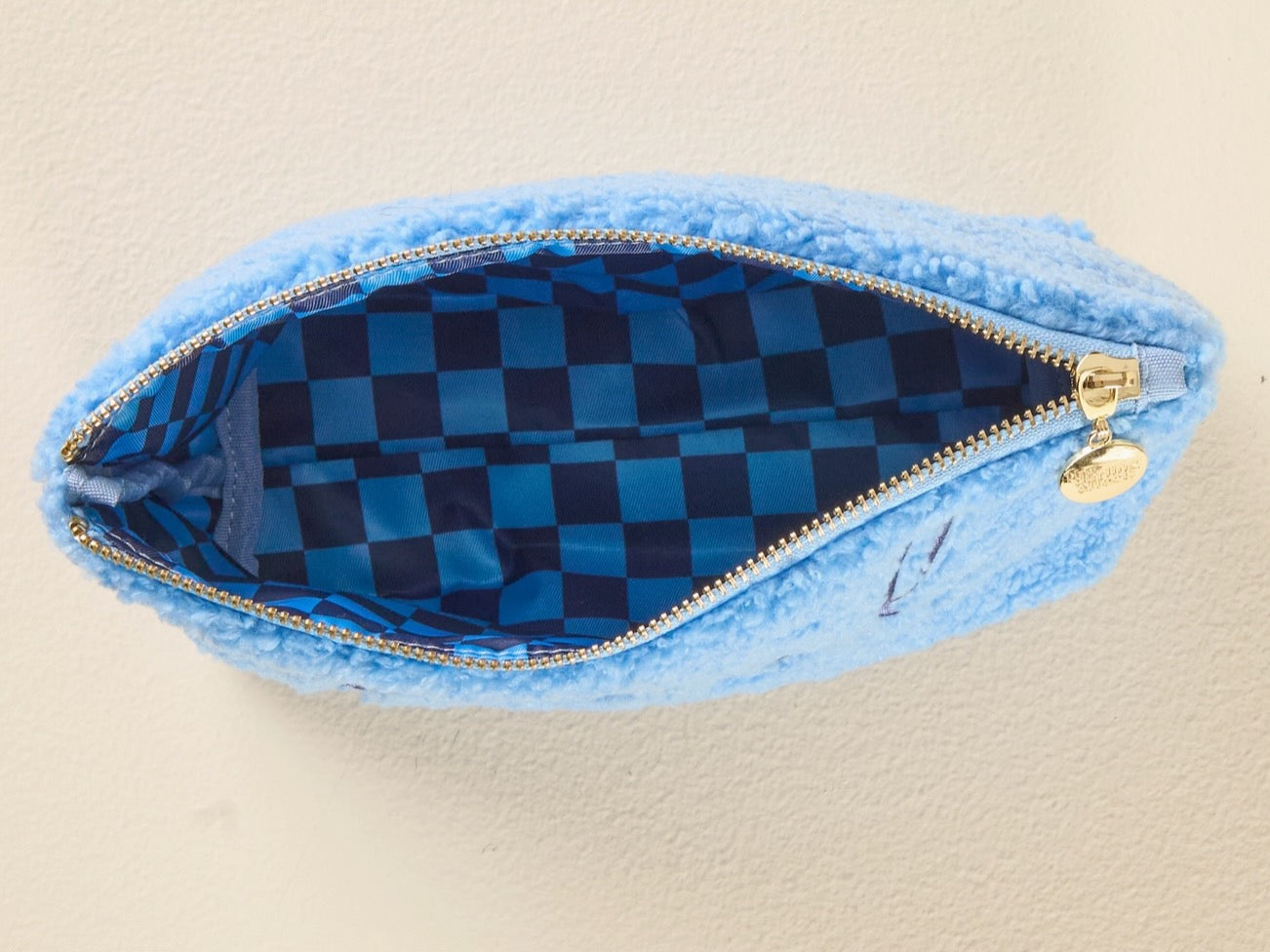 Add a cozy touch to your essentials with our rectangle teddy pouches. Crafted from soft sherpa fabric, these pouches feature a wipeable lining for easy cleaning and gold zippers and hardware for a polished look. The interior is lined with a fun printed fabric, making it as stylish on the inside as it is on the outside. The large rectangle size is perfect for keeping your items organized, and it pairs beautifully with our square or circle options.