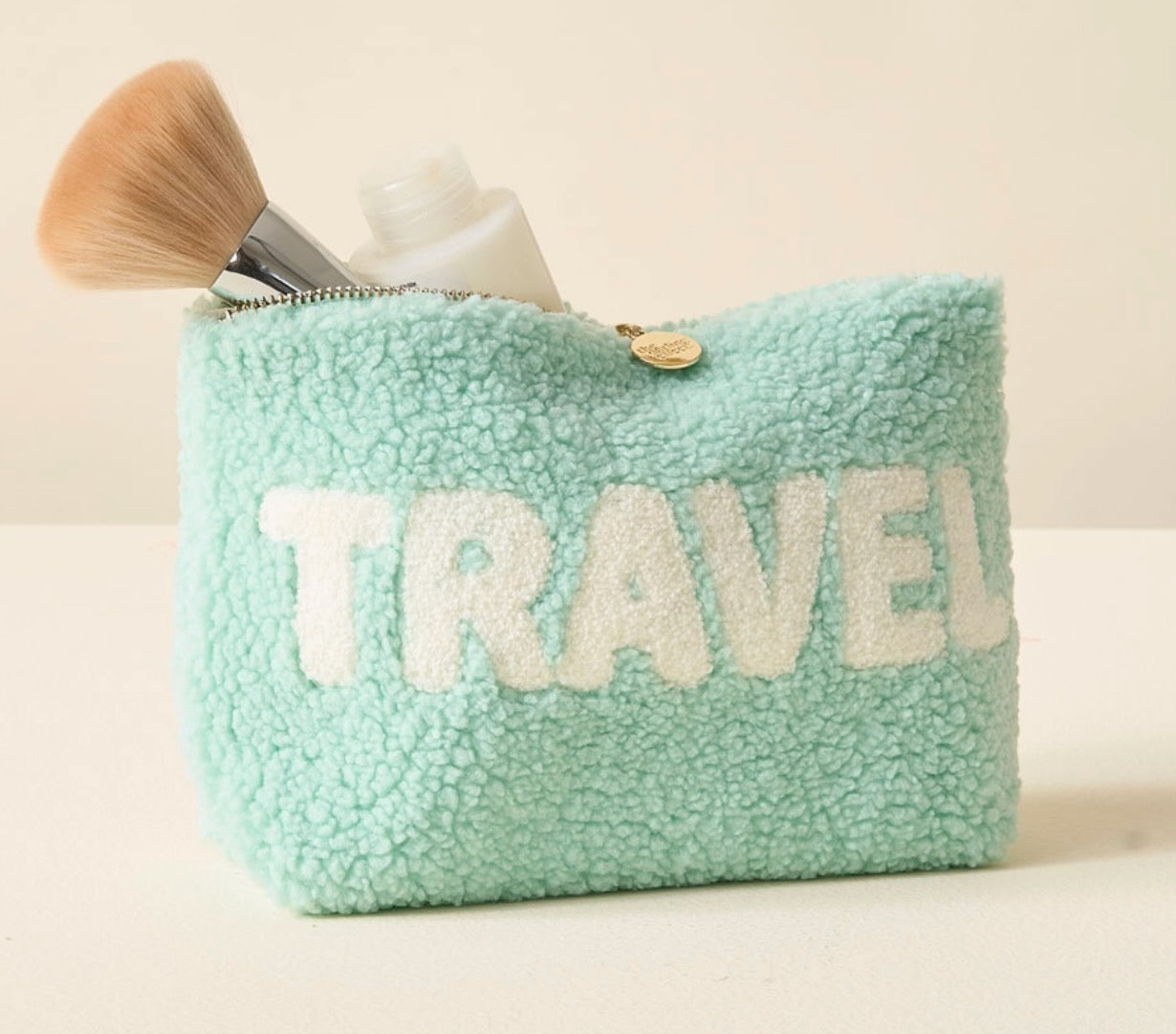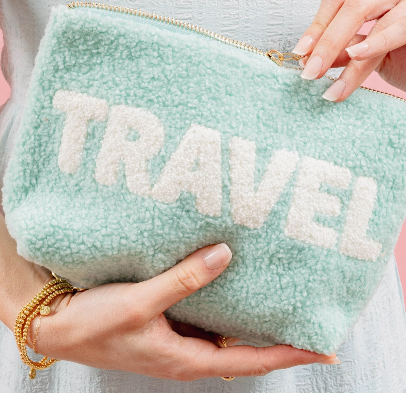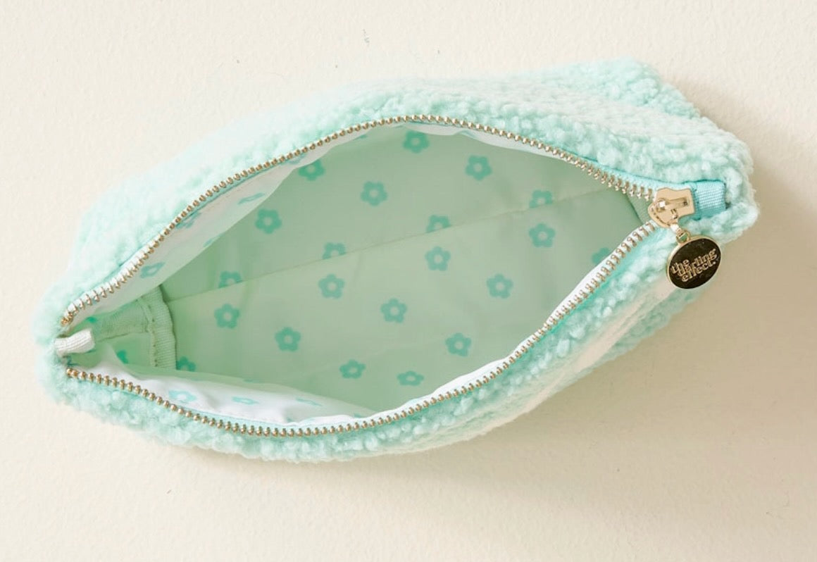 Add a cozy touch to your essentials with our rectangle teddy pouches. Crafted from soft sherpa fabric, these pouches feature a wipeable lining for easy cleaning and gold zippers and hardware for a polished look. The interior is lined with a fun printed fabric, making it as stylish on the inside as it is on the outside. The large rectangle size is perfect for keeping your items organized, and it pairs beautifully with our square or circle options.