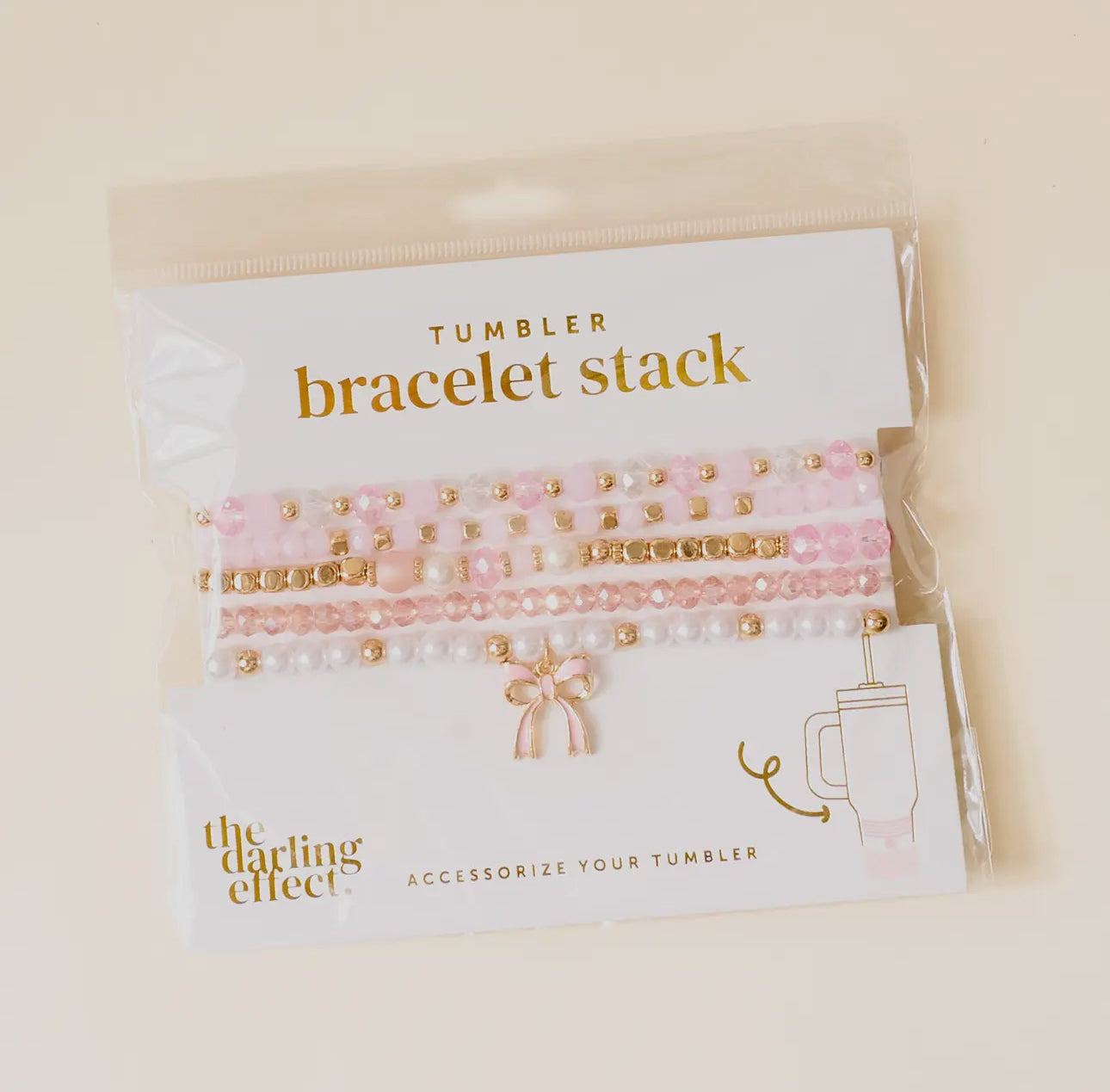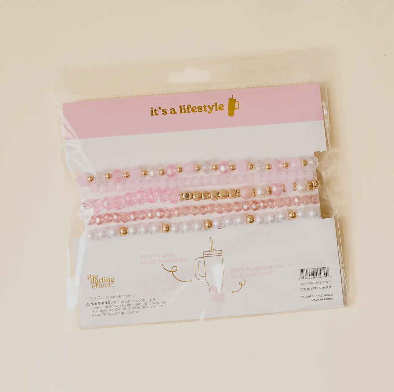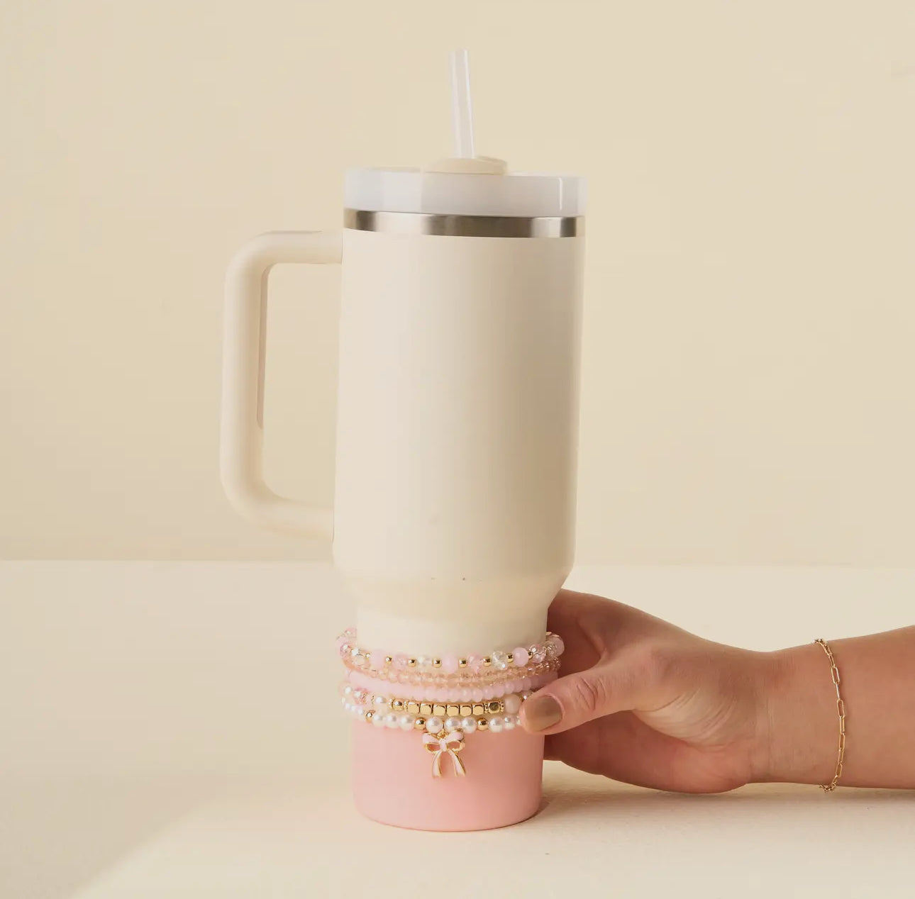 Add charm and personality to your tumbler with our tumbler bracelet stack. This set includes 5 unique bracelets that fit all standard 40 oz tumblers. Pair with a tumbler boot to keep your bracelets secure and prevent slipping. Perfect for personalizing your tumbler and making it uniquely yours, while also offering quick identification and a fun accessory.